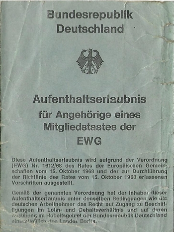 Meanwhile the negotiations rumbled on until one day, quite shockingly, from my point of view, the police – Die Polizie, or more colloquially, Die Bullen, turned us out on the street. We had had a previous visit from them, when we were marched out onto the street and the house was searched, but on that occasion we were dealt with politely enough and then allowed to return. But this second time we were properly evicted or ausgeraumt. It was I think at this time that I acquired a little blue card which I assume to be a kind of visa – I notice it had validity until 21 April 1988 – but to tell the truth I am not quite sure of the significance of this piece of paper, though I still have it.