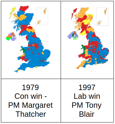 The carve up begins: Scotland turns against Thatcherite Conservatism in 1997. Images adapted from Wikipedia